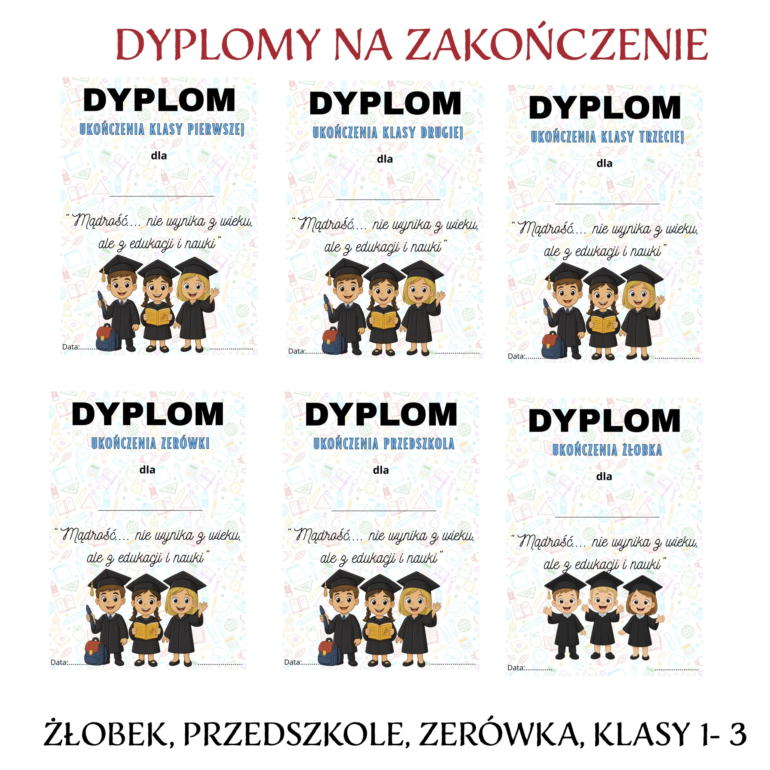Dyplomy na Zakończenie żłobka, przedszkola, klas 1 -3